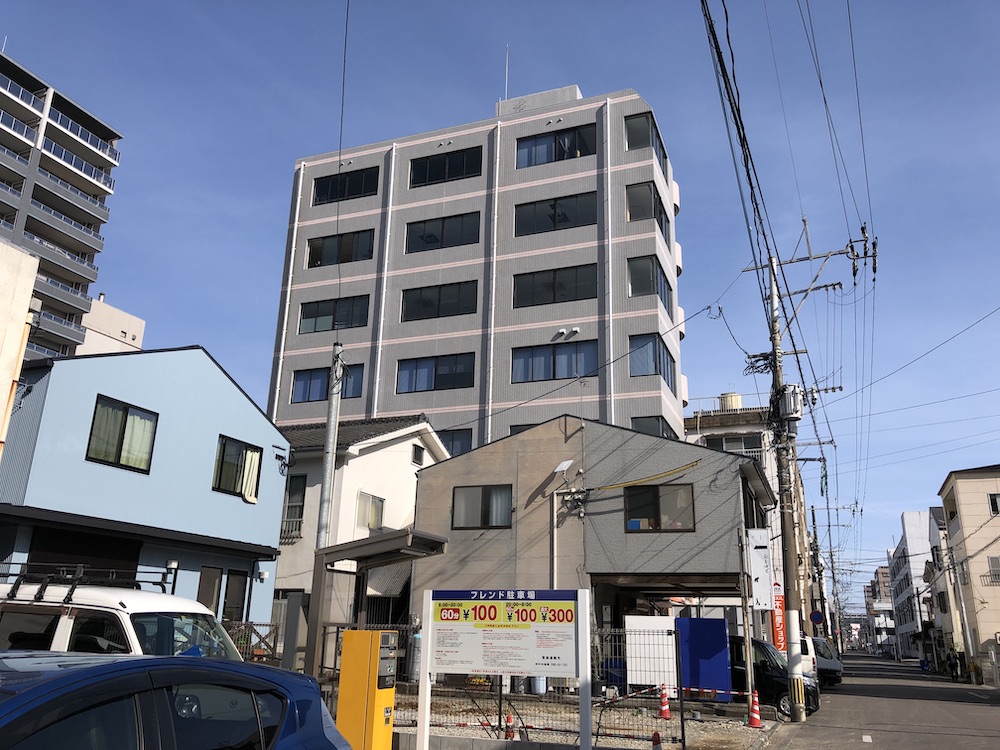 宮崎市中心部のオフィスビル6Fです。1Fの不動産ショップ向かって右側にエレベーターがあります。駐車場はございませんので、公共交通機関または近隣の駐輪場・パーキングをご利用ください。宮崎・青島エリアの駐車場マップ