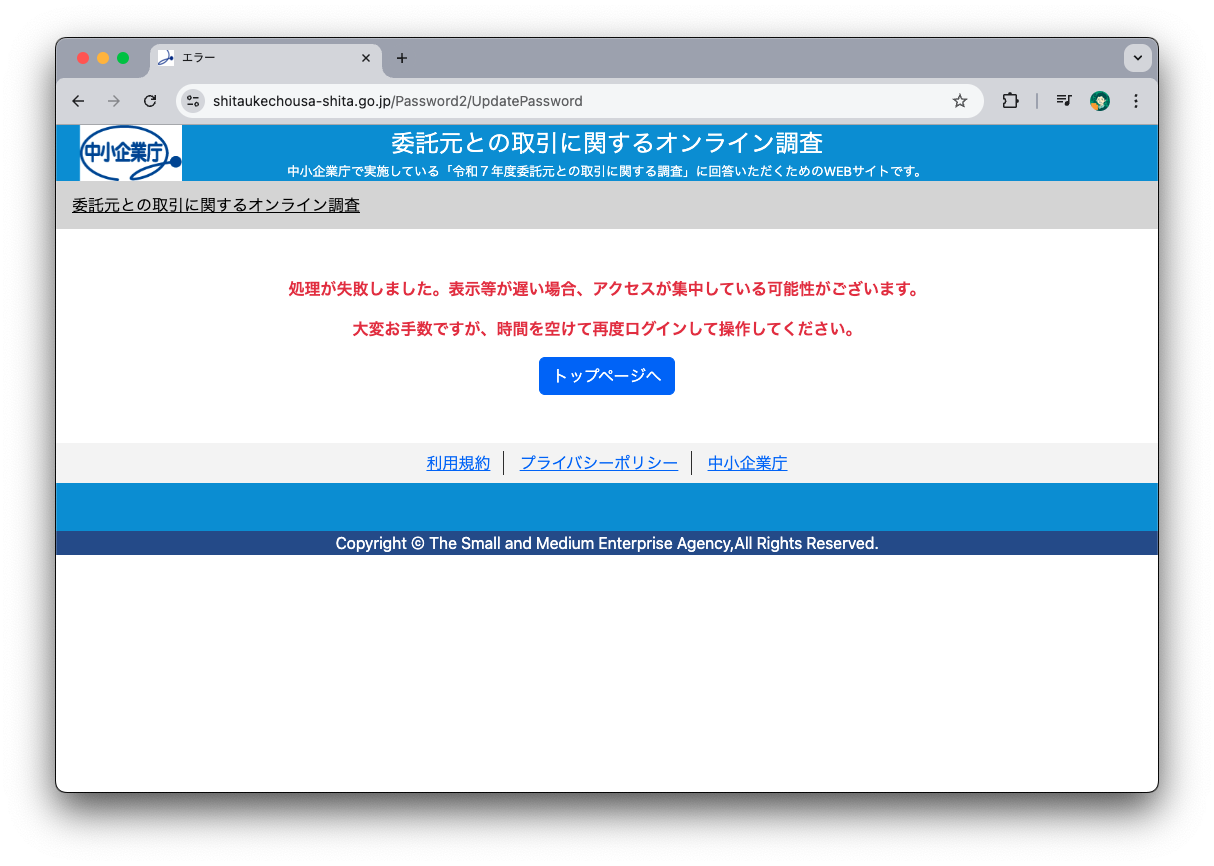 中小企業庁から下請法(取適法)に基づくオンライン調査の依頼が届きました。一応回答しとこうか、と思って何度かアカウント発行(パスワード登録)の手続きにトライしましたが、添付画像の通り…。どうもお役所系のシステムと相性が悪いようです..(^^;